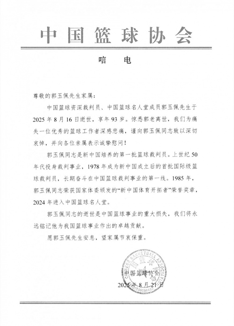 中國籃球資深裁判員、中國籃球名人堂成員郭玉佩先生于2025年8月16日逝世,享年93歲。驚悉郭老離世,我們?yōu)橥词б晃粌?yōu)秀的籃球工作者深感悲痛,謹(jǐn)向郭玉佩同志致以深切哀悼,并向各位親屬表示誠摯慰問!
