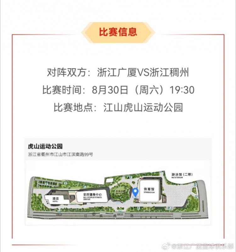 比賽將于8月30日19點(diǎn)半在浙江省江山市虎山運(yùn)動(dòng)公園體育館進(jìn)行,這也是兩隊(duì)休賽期的首秀。