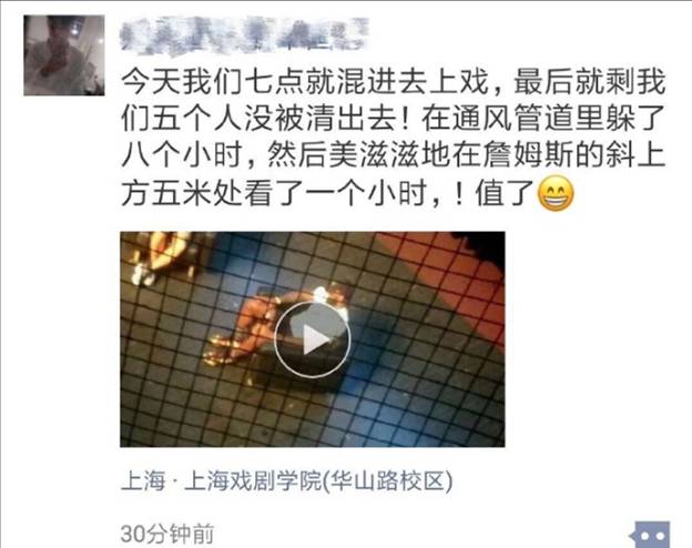2018年詹姆斯中國(guó)行上海站期間,詹姆斯曾造訪上海戲劇學(xué)院。有球迷曬出自己在活動(dòng)現(xiàn)場(chǎng)五米高的通風(fēng)管道里躲了八個(gè)小時(shí),只為見老詹一面。