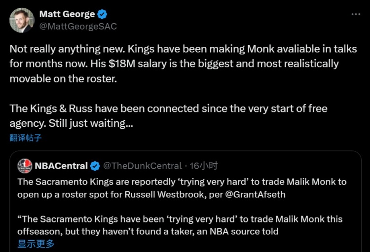 Matt George轉(zhuǎn)發(fā)了一則國(guó)王正努力交易走蒙克,為引進(jìn)威少騰出名額的報(bào)道,在旁邊寫道:“算不上新鮮事。幾個(gè)月來,國(guó)王一直在談判中把蒙克列為可交易的,他的1800萬薪水是這支國(guó)王陣中的大合同里,最有可能能交易出去的資產(chǎn)。