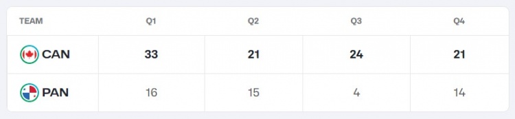8月24日訊 今天結(jié)束的一場男籃美洲杯小組賽,加拿大男籃99比49大勝巴拿馬男籃50分。