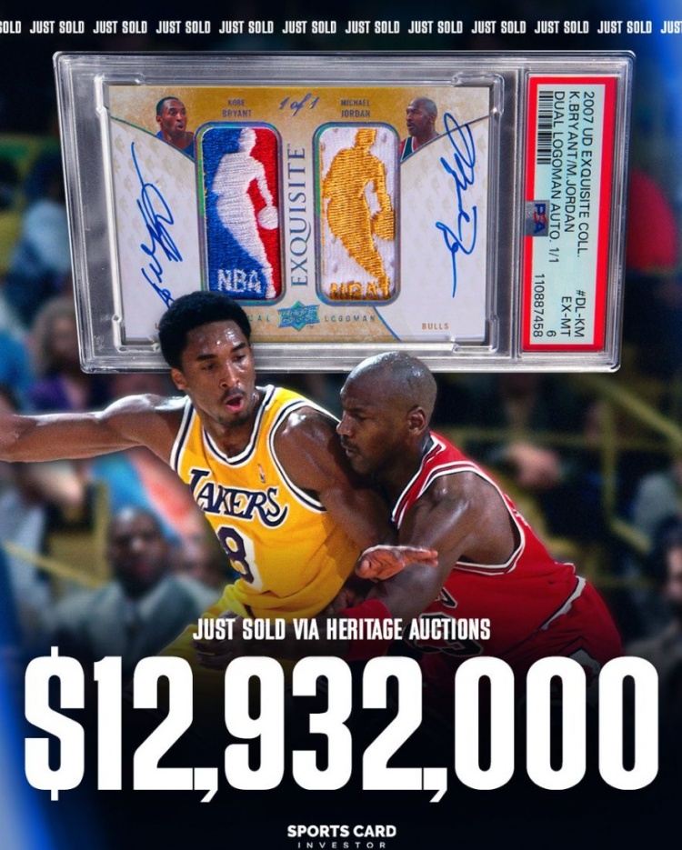 8月24日訊 據(jù)The Athletic報道,一張獨一無二的2007-08賽季Upper Deck Exquisite Collection系列喬丹與科比雙LogoMan(來自他們各自比賽穿過的球衣上的NBA標志補丁)簽名補丁卡,在(美國當?shù)貢r間)周日凌晨通過Heritage Auctions拍賣行以1293.2萬美元的價格售出。