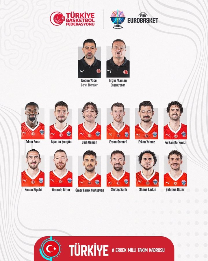 8月25日訊 今天,土耳其公布了征戰(zhàn)25年歐錦賽的12人名單?;鸺袖h申京領(lǐng)銜。