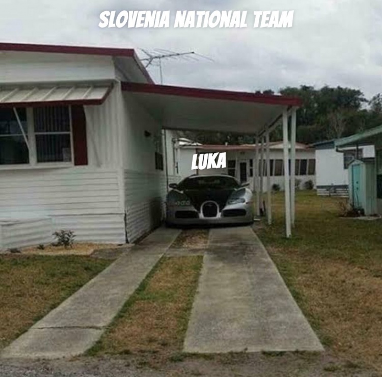 自媒體Luka Updates曬圖為歐錦賽預熱。圖中是一個破敗的小院中停著一輛豪車。豪車上面標注著“Luka”,而這個小院則被標注為斯洛文尼亞男籃。