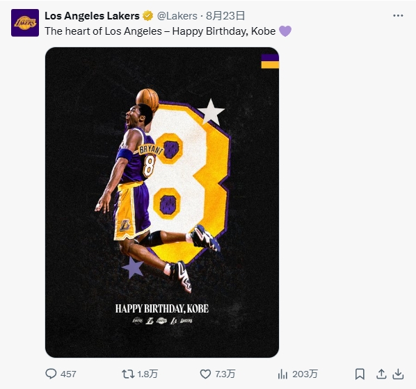 1、湖人官方:“洛杉磯之心,生日快樂,科比 ??”