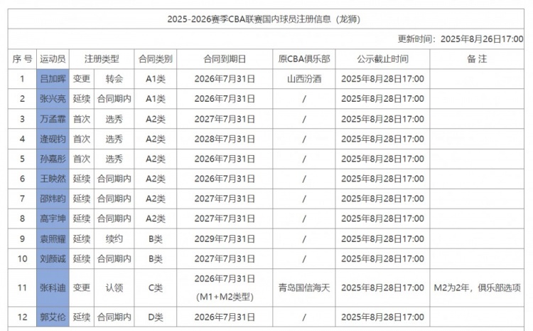 其中,郭艾倫的D類合同明年夏天到期,球隊與袁照耀以B類合同續(xù)約2年,陷入交易傳聞的焦泊喬暫未注冊。