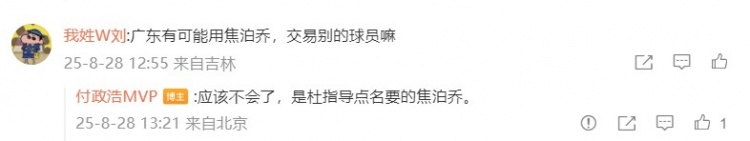 有網(wǎng)友問廣東有沒可能用焦泊喬交易別的球員,付政浩回復:“應該不會了,是杜指導點名要的焦泊喬?!?/p>