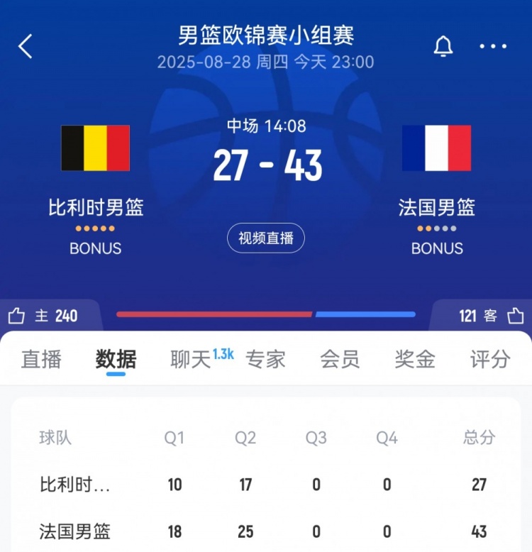 8月28日訊 男籃歐錦賽小組賽,法國男籃半場43-27領(lǐng)先比利時男籃。