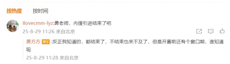 與網(wǎng)友互動時,@勇方方 表示他所知道的內(nèi)援引進(jìn)都結(jié)束了。