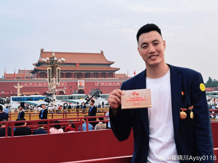 北京首鋼男籃隊(duì)長(zhǎng)翟曉川,戴著北京青年榜樣獎(jiǎng)?wù)潞褪卒搫趧?dòng)模范獎(jiǎng)?wù)?,參加今天的閱兵儀式。