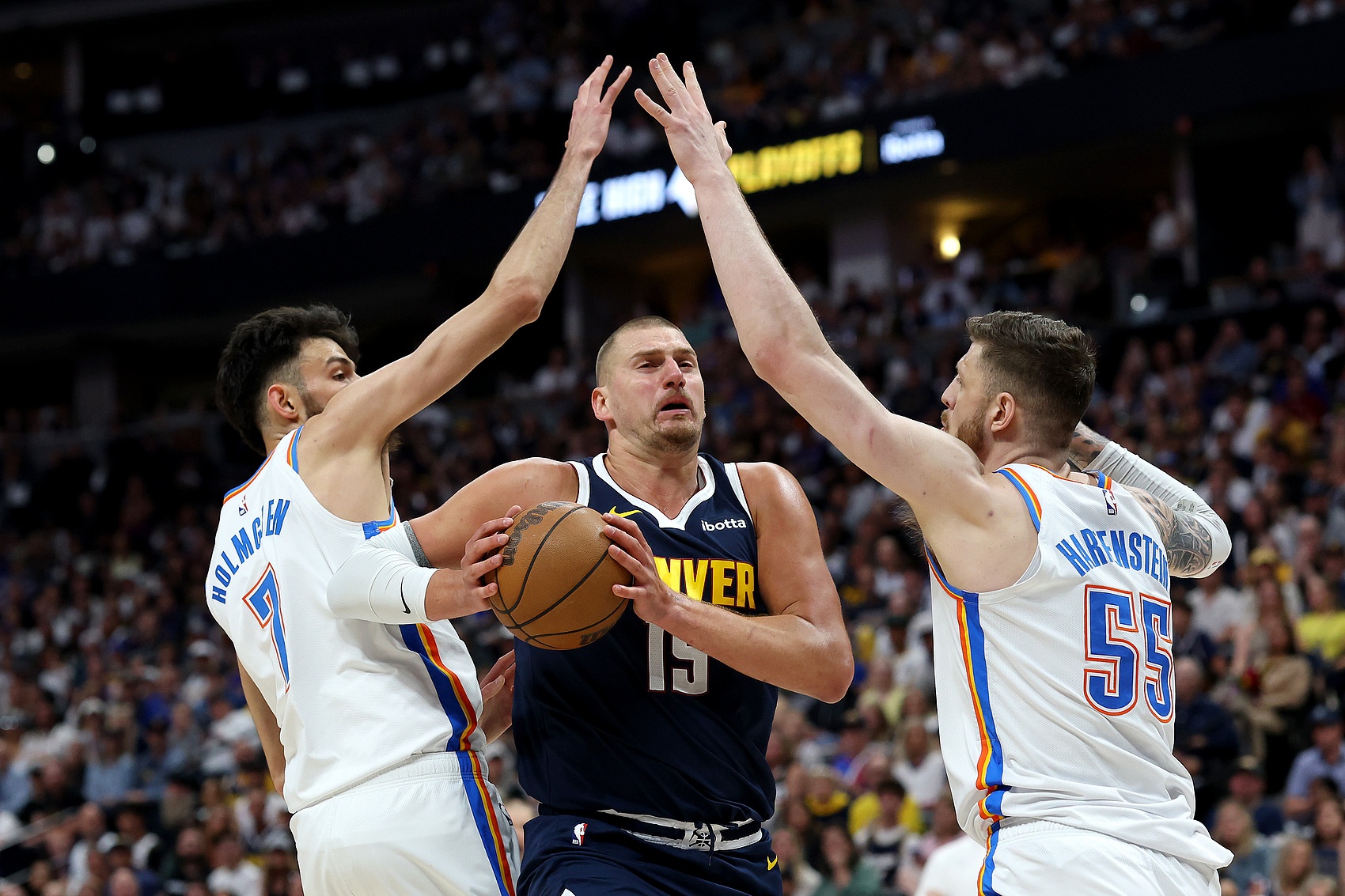 掘金常規(guī)賽籃下得分高居聯(lián)盟榜首,卻在半決賽的八支球隊(duì)中墊底。這種斷崖式下滑的根源,是他們?cè)庥隽水?dāng)今聯(lián)盟最具統(tǒng)治力的防守體系。頂級(jí)防守的標(biāo)志是能遏制對(duì)手的招牌武器,但雷霆對(duì)掘金所做的遠(yuǎn)超于此:他們將一支頂級(jí)進(jìn)攻球隊(duì)的殺手锏直接打成了軟肋。