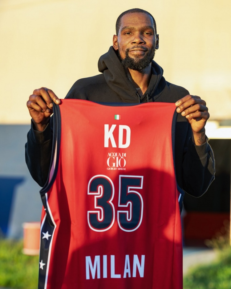 米蘭阿瑪尼在社媒曬出杜蘭特手持球衣的照片,并配文:“紅色真適合你,KD 。感謝你的到訪?!?/p>