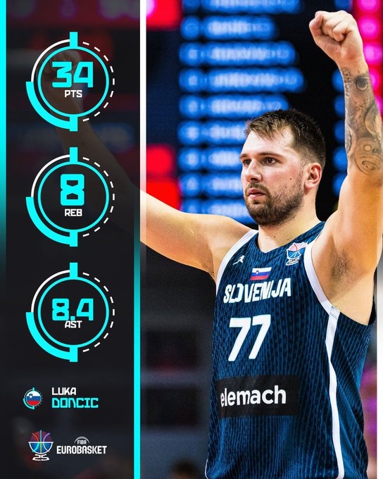 小組賽階段,東契奇數(shù)據(jù)炸裂,場(chǎng)均34分8籃板8.4助攻。