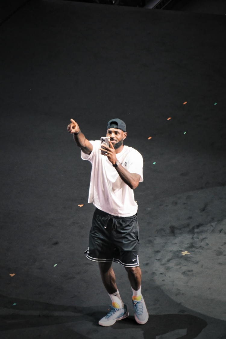 或許是驚訝于現(xiàn)場上萬名球迷的激情澎湃,詹姆斯一出場亮相就掏出手機(jī)環(huán)拍一圈所有球迷的歡呼場景。