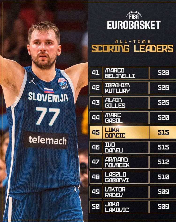 本場比賽過后,東契奇歐錦賽總得分來到515分,暫列歷史第45位,排在他前面的是馬克-加索爾;而歐錦賽的歷史得分王為保羅-加索爾(1183分)。