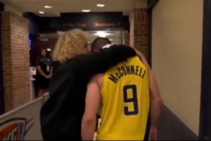 在視頻中擁抱我的人其實是我們的球員人事副總裁凱倫-阿特克森。在我為步行者效力的六個賽季里,我和凱倫建立了很好的關(guān)系。她看到我淚流滿面,情緒激動,便給了我一個大大的擁抱,并試圖安慰我。當電視攝像機開始跟隨我時,她出于對我的支持而本能地做出了反應(yīng)。