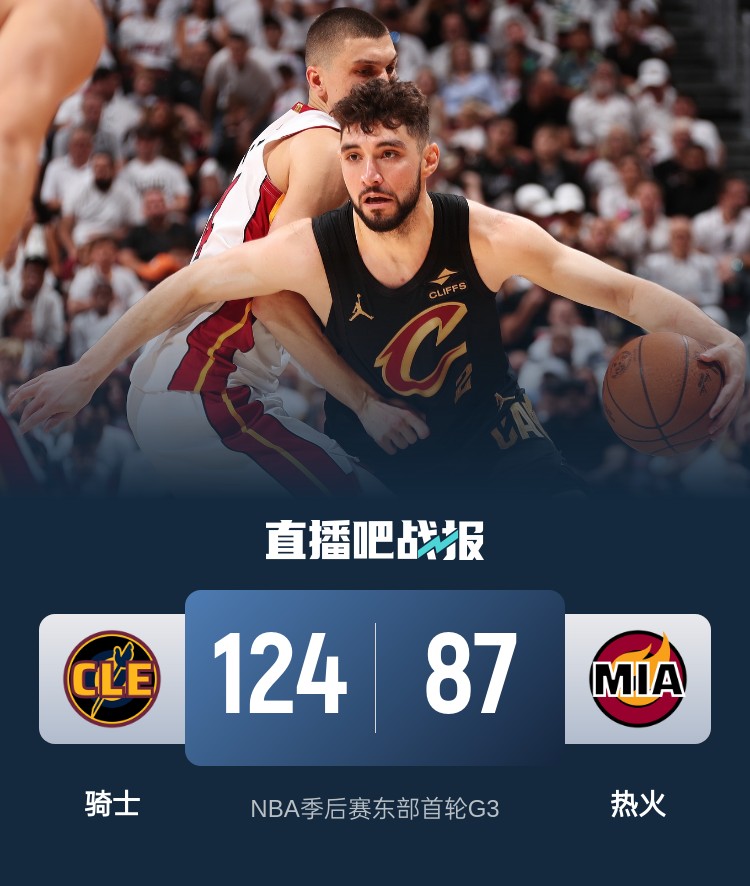 比賽開始,阿德巴約聯(lián)手韋爾里突外投帶隊(duì)打出12-4不錯(cuò)開局,杰羅姆上來連送助攻,亨特和阿倫連續(xù)攻擊籃下,騎士轟出18-0超級(jí)攻擊波反超比分,斯特魯斯壓哨三分首節(jié)助騎士領(lǐng)先13分,次節(jié)雙方對(duì)飆三分后命中率下降,熱火失誤還是不少,騎士7-0繼續(xù)擴(kuò)大領(lǐng)先,隨后騎士?jī)?nèi)線繼續(xù)各種扣籃半場(chǎng)領(lǐng)先到20分。下半場(chǎng),騎士4分多鐘僅得2分被熱火追分,但米切爾和亨特、杰羅姆接連3記三分強(qiáng)勢(shì)回應(yīng)穩(wěn)局勢(shì),騎士三節(jié)領(lǐng)先到24分,末節(jié)雙方圍繞著二十幾分的分差繼續(xù)拉鋸戰(zhàn),騎士能回應(yīng)并擴(kuò)大領(lǐng)先,最終騎士124-87大勝熱火,總比分3-0拿到賽點(diǎn)。