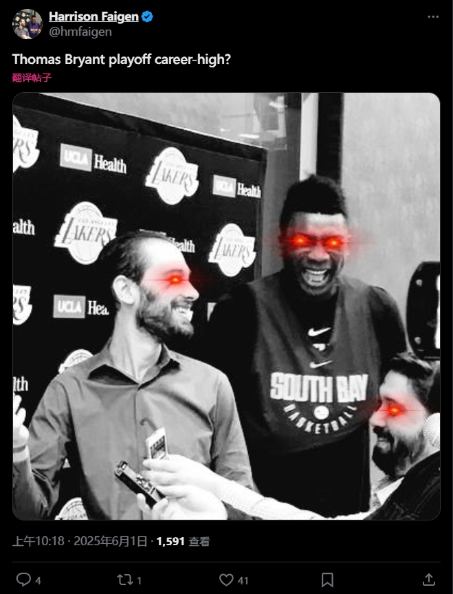 湖人記者Harrison Faigen發(fā)推寫(xiě)道:“托布季后賽生涯新高?!”