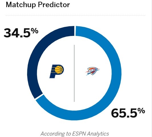 ESPN更新了雷霆和步行者G1的勝率,雷霆65.5%,步行者34.5%。