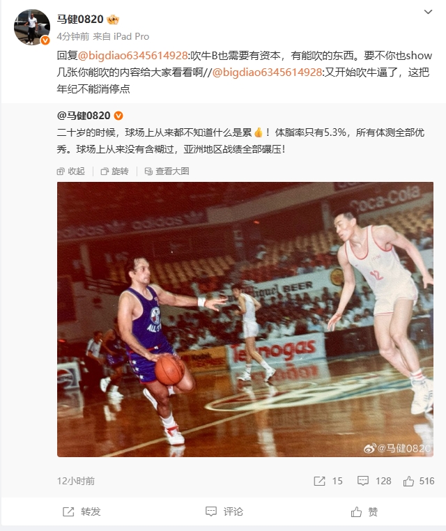 “二十歲的時(shí)候,球場上從來都不知道什么是累??!體脂率只有5.3%,所有體測全部優(yōu)秀。球場上從來沒有含糊過,亞洲地區(qū)戰(zhàn)績?nèi)磕雺海????”馬健寫道。