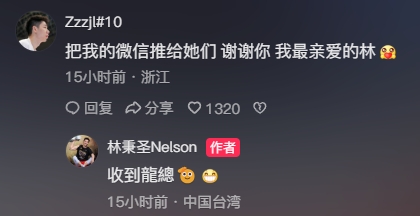 朱俊龍本人現身林秉圣社媒視頻評論區(qū),他寫道:“把我的微信推給她們,謝謝你,我最愛的林?!?/p>