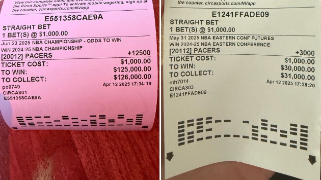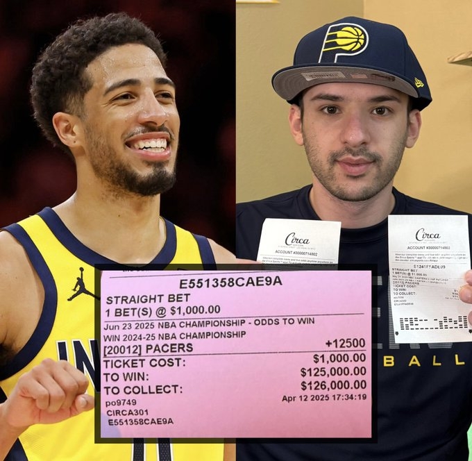 前者的賠率是125倍,后者的賠率是30倍,兩個選項他各買了1000美元,目前已經(jīng)凈賺了30000美元(東部冠軍),如果步行者最終奪得總冠軍,他還能再賺12.5萬美元。