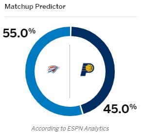 ESPN隨后更新了系列賽G3的獲勝概率:雷霆55%,步行者45%。