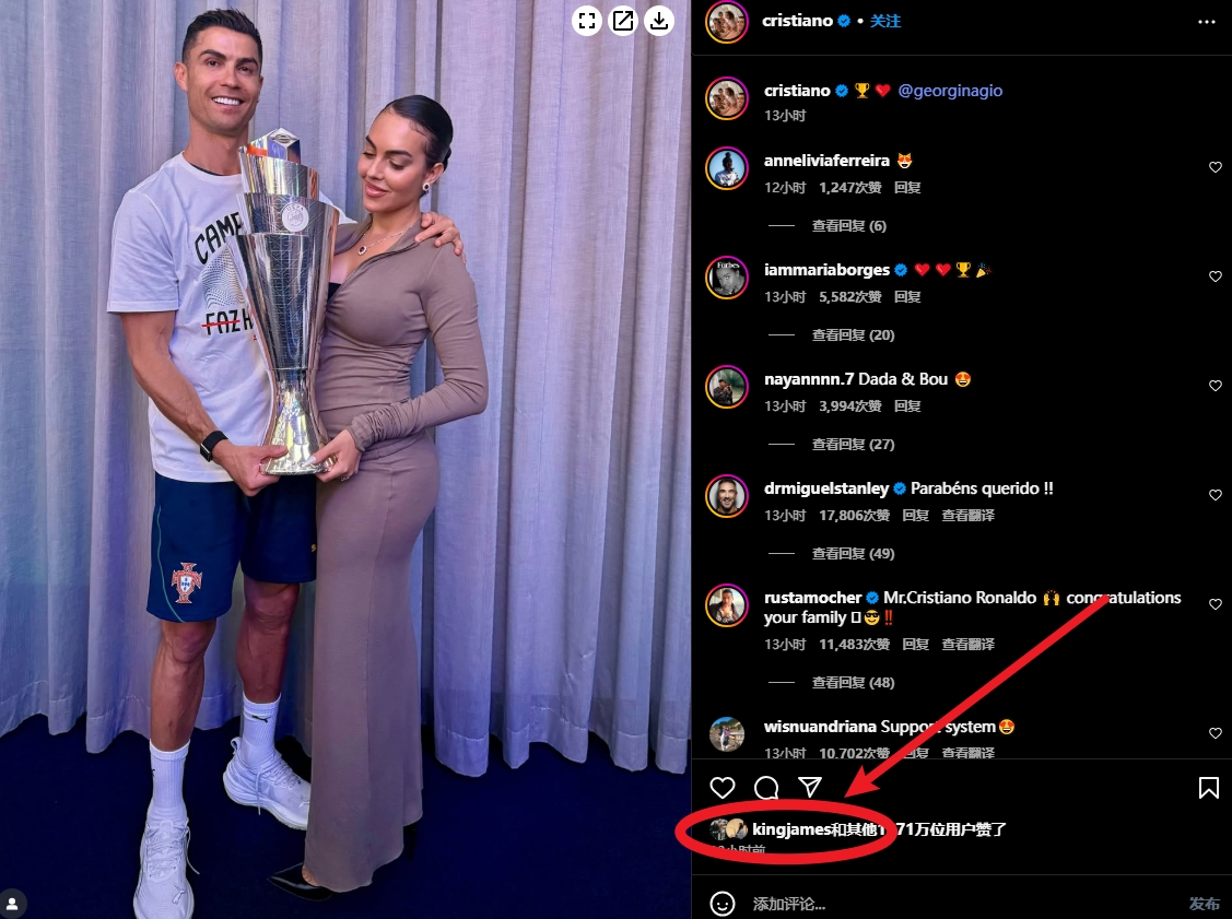 詹姆斯給C羅的這條動(dòng)態(tài)下點(diǎn)了一個(gè)贊。