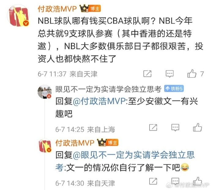 6月10日訊 今天,媒體人付政浩在社媒上談到了NBL俱樂部安徽文一,表示這支球隊這兩天被傳出解散的傳聞。
