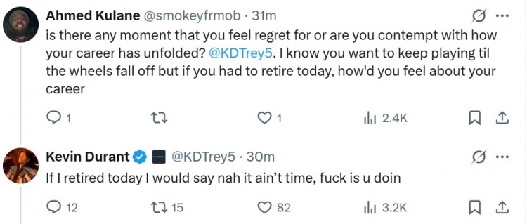 網(wǎng)友:有沒有哪一刻讓你感到后悔,或者你對(duì)自己的職業(yè)生涯感到滿意嗎? KD,我知道你想一直打到不能再打?yàn)橹梗绻憬裉觳坏貌煌艘?,你?huì)怎么看待自己的職業(yè)生涯?