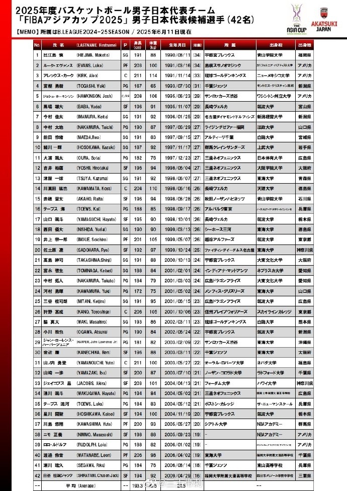 在曬出的日本男籃集訓(xùn)名單中,多達(dá)42人,其中:河村勇輝、馬場雄大、比江島慎、富永啟生、富堅勇樹等主力球員在列,歸化球員霍金森、科克、埃文斯等也在。而渡邊雄太和八村塁不在其中。