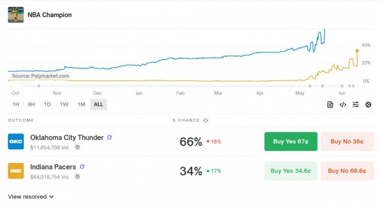 據(jù)數(shù)據(jù)媒體Polymarket Hoops實時統(tǒng)計,目前雷霆奪冠概率下降18%,但仍高達(dá)66%,步行者奪冠概率為34%。