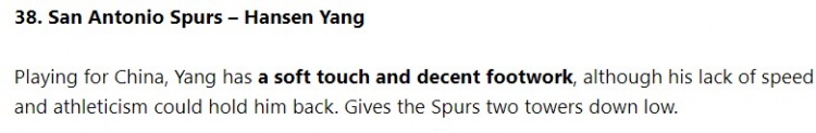NBA Analysis Network方面對(duì)楊瀚森給出如下評(píng)價(jià):“楊代表中國(guó)隊(duì)出戰(zhàn)時(shí),展現(xiàn)了柔和的手感和不錯(cuò)的腳步技術(shù),盡管他的速度和運(yùn)動(dòng)能力稍顯不足,可能會(huì)限制他的發(fā)揮。不過(guò),他為馬刺在內(nèi)線提供了雙塔組合的可能?!?/p>
