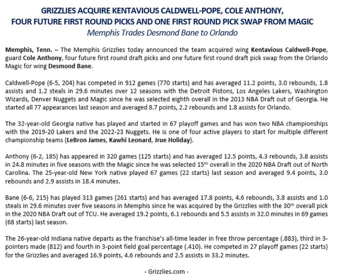 6月16日訊 今日灰熊與魔術(shù)達(dá)成交易,他們送出貝恩,從魔術(shù)獲得波普、科爾-安東尼、四個(gè)未來(lái)首輪簽和一個(gè)首輪簽互換權(quán)。