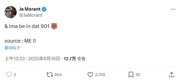 莫蘭特寫道:“我會(huì)留在901區(qū)(孟菲斯的區(qū)號(hào)),消息源是我自己!”并配上了一個(gè)熊頭??的表情。