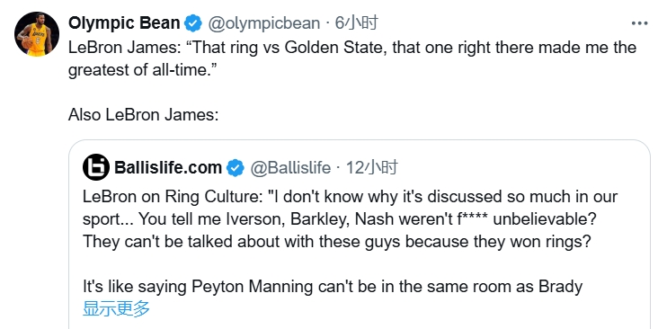 美媒搬出了詹姆斯在2018年的一段采訪,表示詹姆斯的言論自相矛盾,當(dāng)時(shí),詹姆斯表示:“2016年對勇士的那個(gè)總冠軍,讓我覺得我自己是史上最佳球員?!?/p>