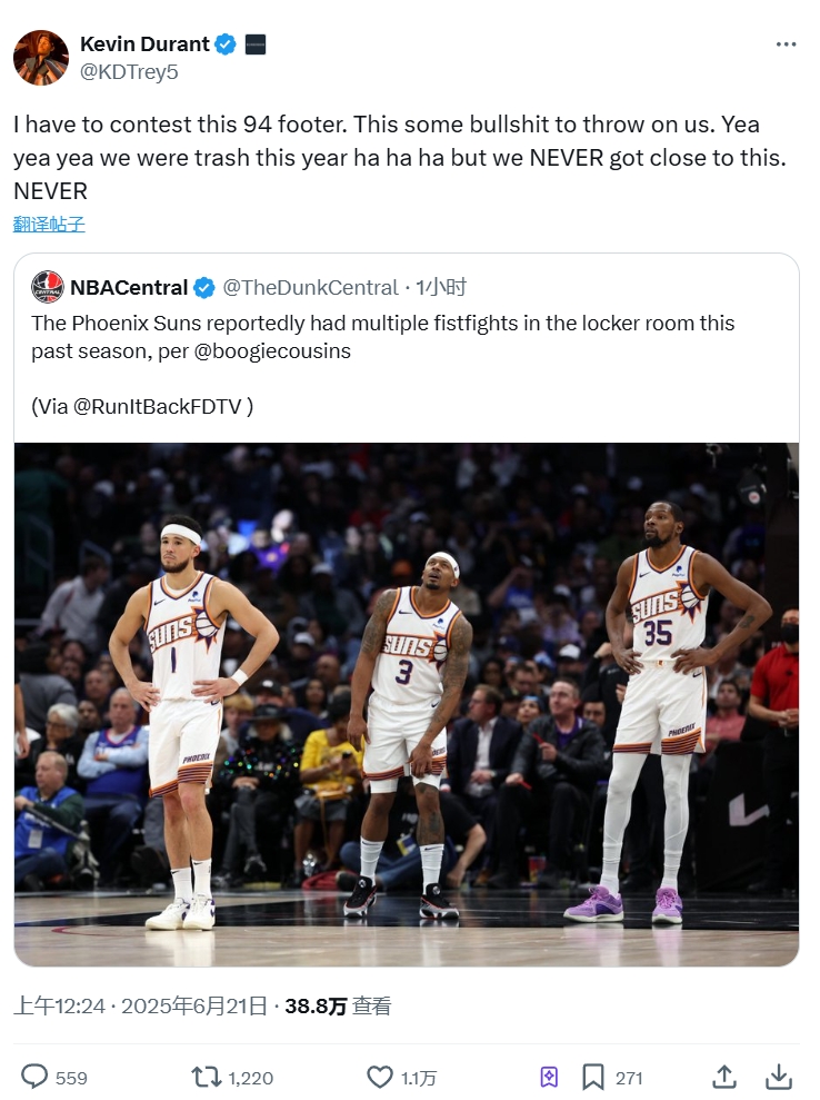 正主杜蘭特上號(hào)反駁:“我必須得出來說道說道,這完全是瞎胡扯的狗屎。啊對(duì)對(duì)對(duì),我們這賽季是很垃圾、很爛,哈哈哈,但是我們從沒干過這些事兒(更衣室打架),從來沒有!”