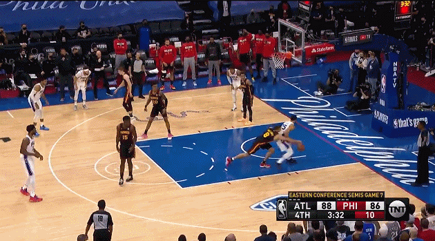 第四節(jié)關(guān)鍵時刻一回合,本-西蒙斯背打過掉了加里納利,但面對空籃他但卻選擇了傳球,當(dāng)時補防過來的特雷-楊距其仍有一段距離。