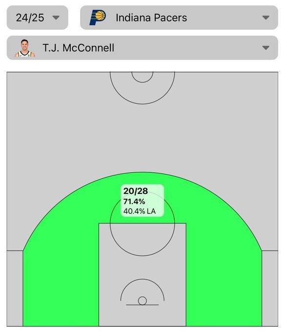 6月22日訊 美媒曬出一則步行者后衛(wèi)麥康納的中投數(shù)據(jù),整個季后賽期間,麥康納在三秒?yún)^(qū)外的中投28投20中,命中率高達(dá)71.4%。