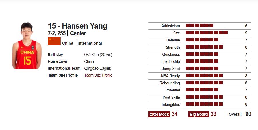 06月22日訊 老牌選秀網(wǎng)站NBA Draft更新了楊瀚森的選秀報告,在多維度評分方面,楊瀚森綜合評分90。