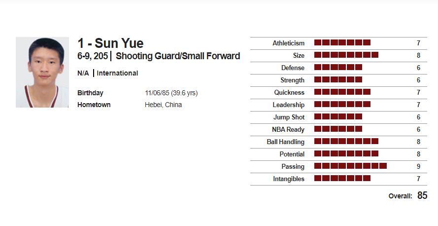 在這套評分體系里,周琦是86分,王哲林也是86分,孫悅85分,易建聯(lián)94分。
