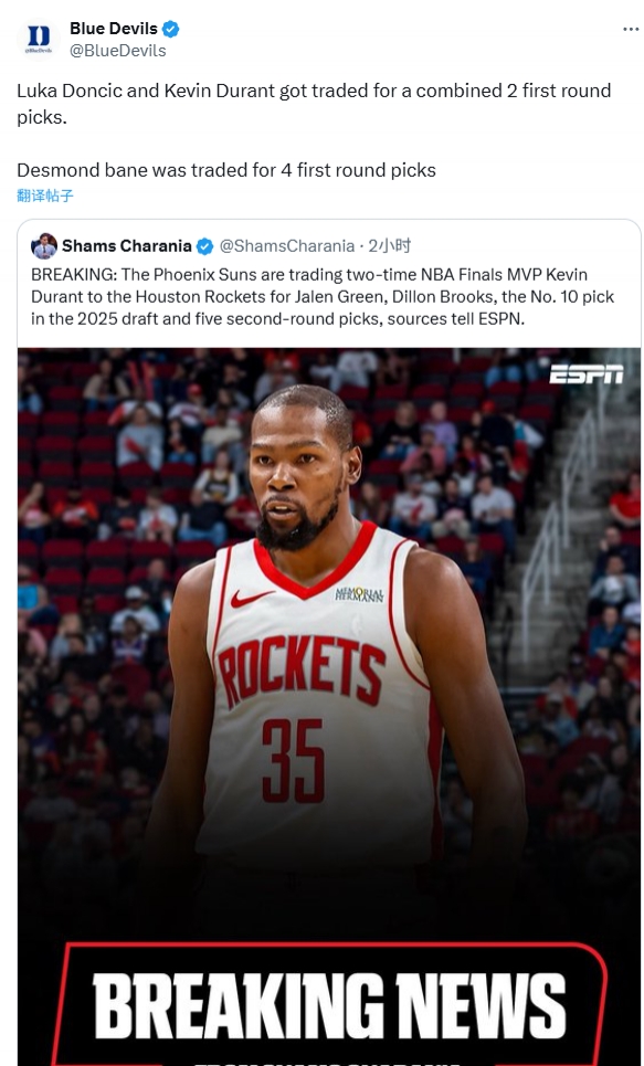 06月23日訊 ESPN名記Shams爆出重磅交易!多位消息人士透露,超級(jí)球星、36歲的杜蘭特被送去火箭,太陽得到杰倫-格林、狄龍-布魯克斯、2025年10號(hào)簽和5個(gè)次輪簽。