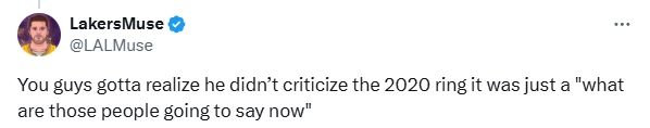 一位湖人球迷自媒體賬號更新了社交媒體回復了卡魯索的發(fā)言:“你們必須意識到他(卡魯索)并沒有批評2020年的戒指,他只是在問‘人們現(xiàn)在還能對我說什么?’”