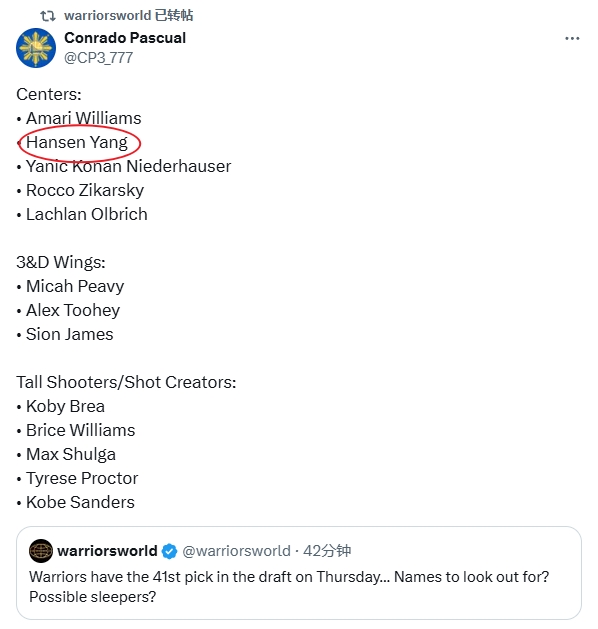 灣區(qū)體育媒體賬號(hào)Conrado Pascual轉(zhuǎn)發(fā)了此推文,按照中鋒、3D側(cè)翼、高射手/持球手的角色劃分列舉了一些名字(如下),其中中鋒位置上,楊瀚森在列。