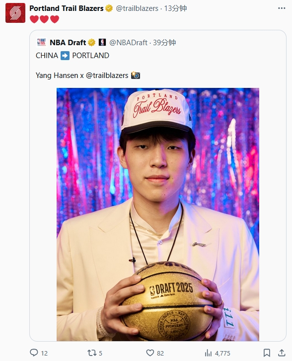 中國球員楊瀚森在首輪第16順位被選中加盟開拓者