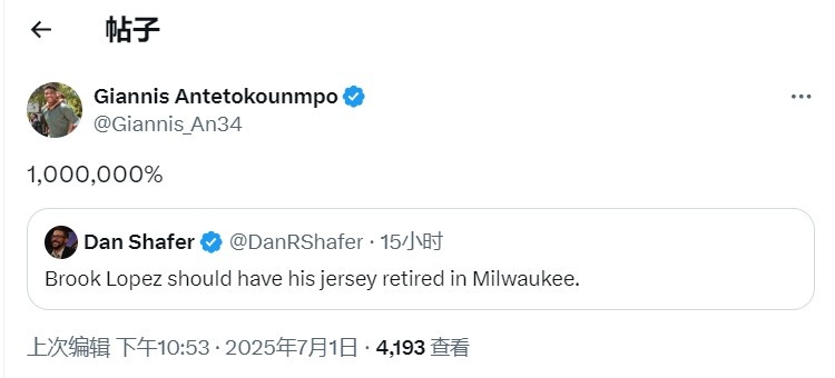 今天,字母哥在社媒上轉(zhuǎn)發(fā)了一名雄鹿球迷的言論,該球迷寫道:“大洛的雄鹿球衣應(yīng)該得到退役的待遇?!弊帜父甾D(zhuǎn)發(fā)后在旁邊寫道:“1,000,000%的?!?/p>