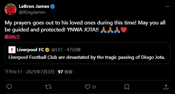 洛杉磯當(dāng)?shù)貢r(shí)間凌晨3:11分,身為利物浦小股東的湖人球星詹姆斯發(fā)推悼念若塔:“在這艱難時(shí)刻,我的心與他的家人們同在!愿你們都能得到指引和庇佑!你永不獨(dú)行,若塔!(YNWA JOTA!)”
