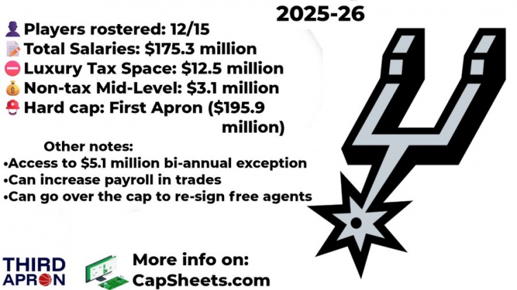 馬刺目前已經(jīng)被第一硬帽,他們的總薪資不能超過1.95億,還有2000萬距離。