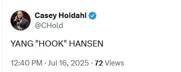 比賽末節(jié)楊瀚森利用腳步單打奎因得手,開(kāi)拓者隊(duì)記Casey Holdahl發(fā)推感嘆道:“楊‘天勾’瀚森?!?/p>