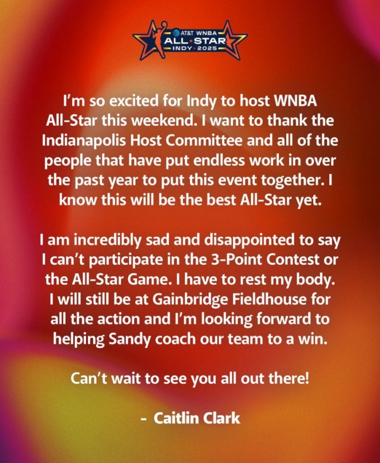 7月18日訊 印第安納狂熱球星凱特琳-克拉克自宣布將不會參加本周末的全明星賽和三分大賽。